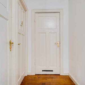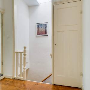 Overloop, drie ruime slaapkamers; de (hoofd)slaapkamer aan de voorzijde van de woning beschikt over een fraaie schouw en hoge raampartijen met glas in lood. De andere twee slaapkamers bevinden zich aan de achterzijde van de woning, waarvan één slaapkamer met toegang tot het zonnige dakterras.