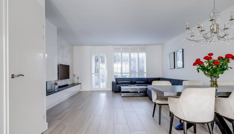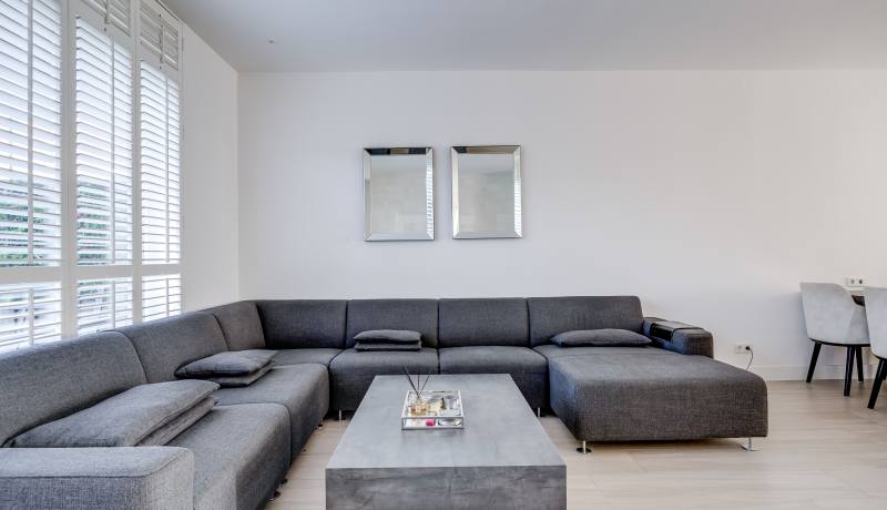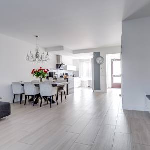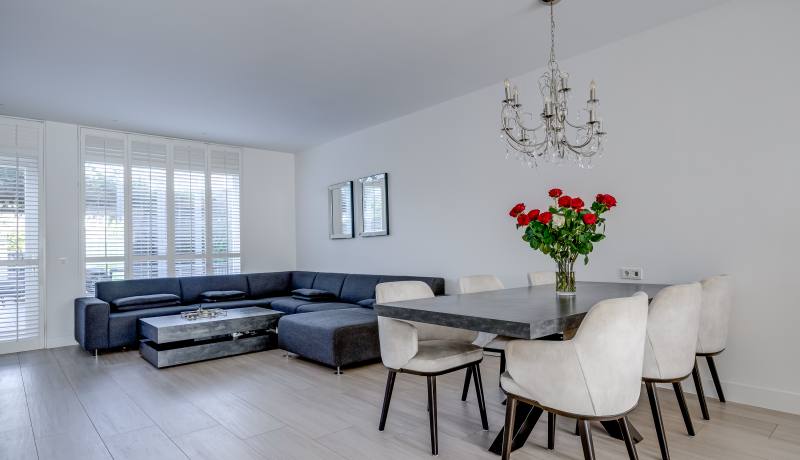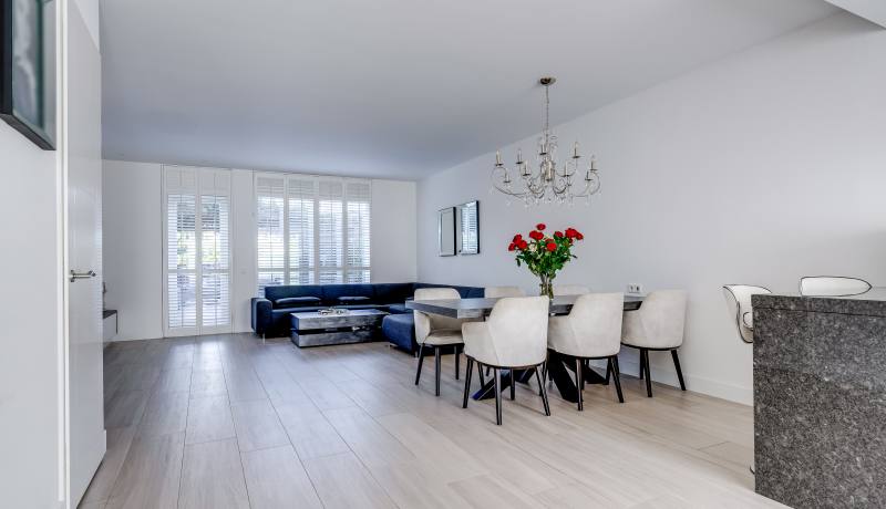 Upon entering through the front door, you step into a spacious hallway with a meter cupboard, toilet, and staircase. From here, you access the generous and bright living room with French doors opening onto the garden. Thanks to the large windows, the room enjoys natural light throughout the day.
