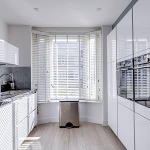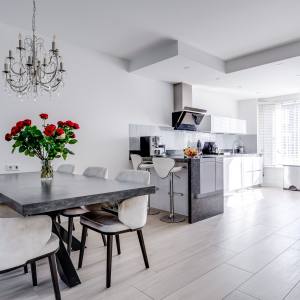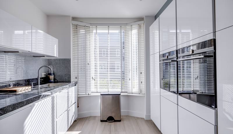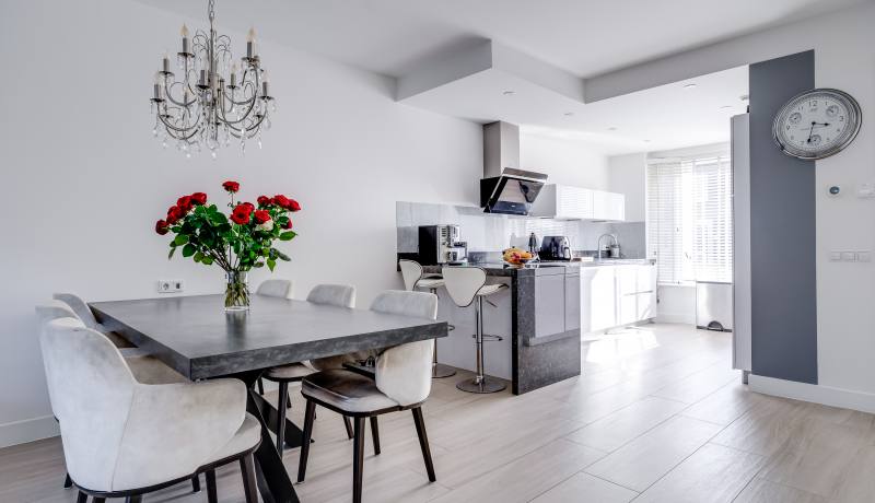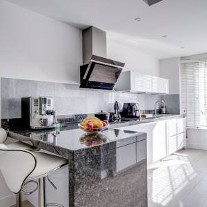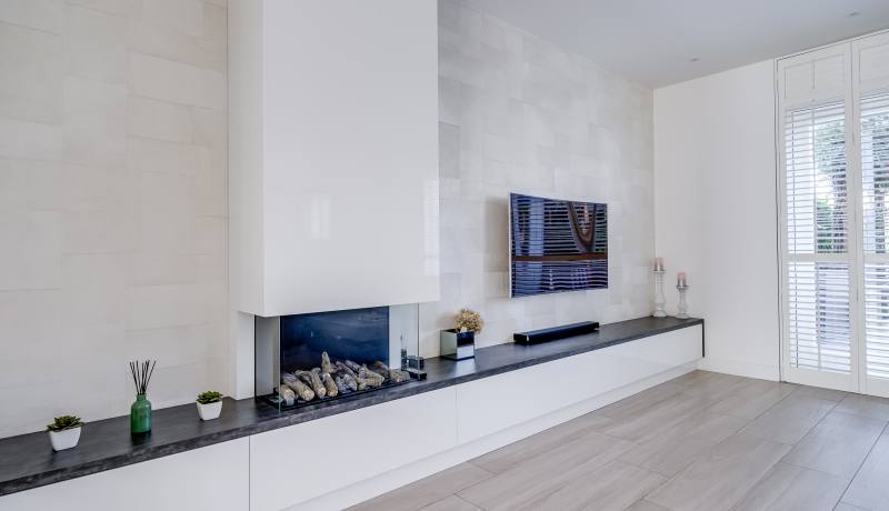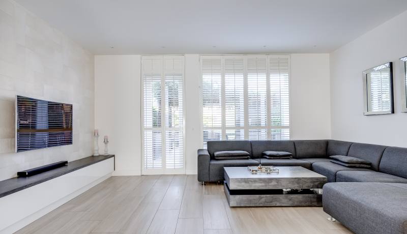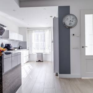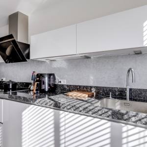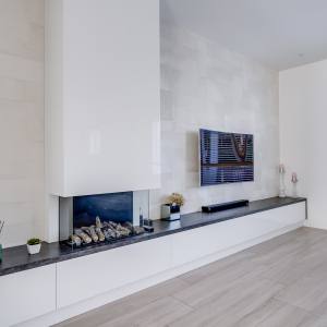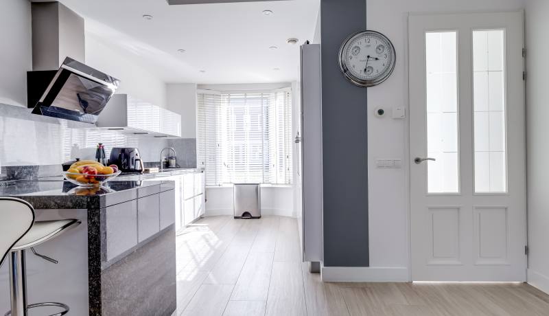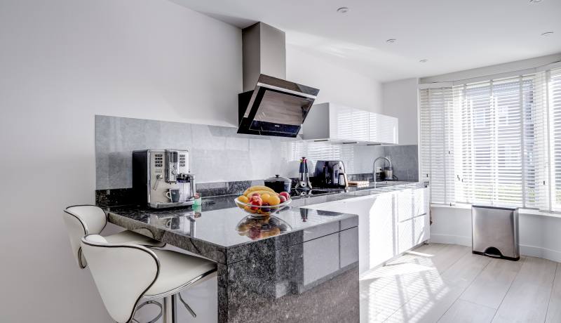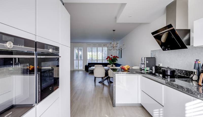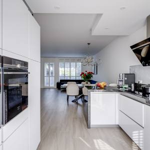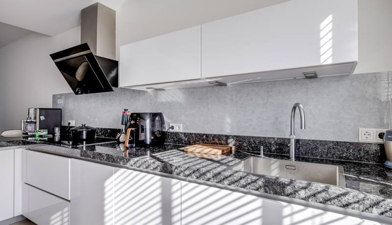 The open-plan kitchen at the front is sleek and modern, equipped with various built-in appliances (including an induction hob, oven, dishwasher, fridge-freezer, and Quooker). The entire ground floor features underfloor heating, ensuring comfort in every season.