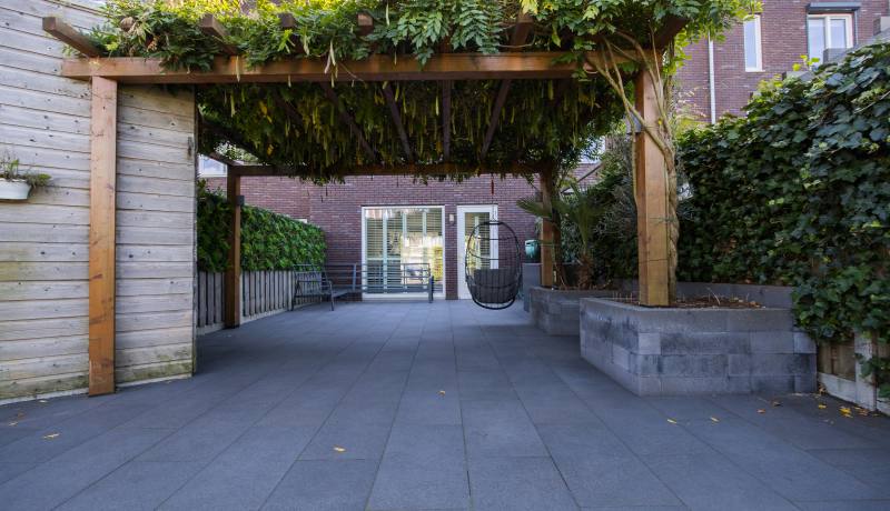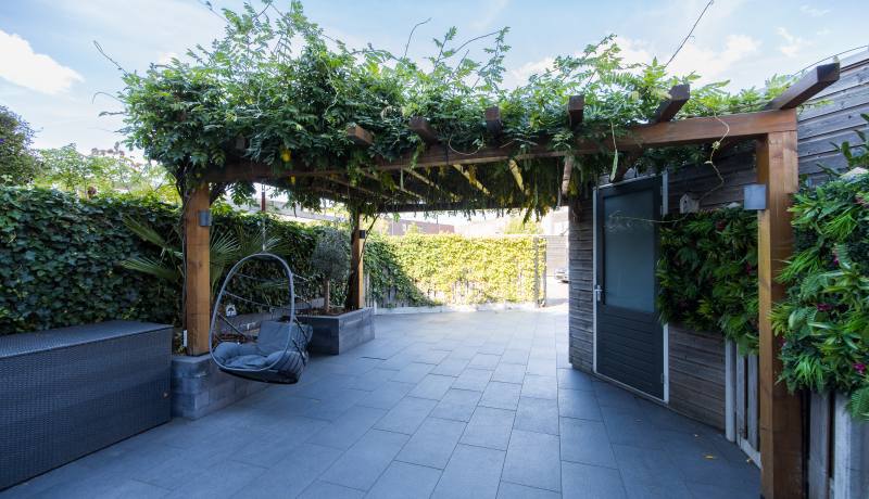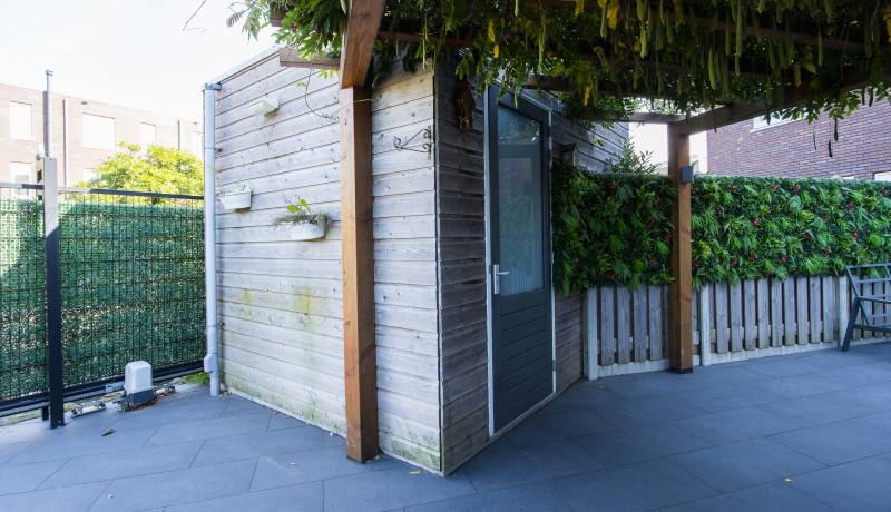 - Tuin met achterom en vrijstaande houten berging (5 m²)