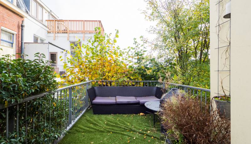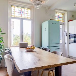 De woonkamer is bijzonder sfeervol door de hoge plafonds (2.79m) met ornamenten en de glas-in-lood ramen. Er ligt een houten visgraatvloer en met oude kamer-en-suite deuren is een handige inbouwkast gemaakt. De woonkamer is bijna 5 meter breed dus je hebt ruimte genoeg om het in te delen. De keuken ligt aan de achterzijde en is bijzonder strak afgewerkt. Fraai werkblad, afzuigkap in de inductiekookplaat weggewerkt, vaatwasser, vriezer en een koelkast maken dit tot een complete keuken. Vanuit de keuken bereik je het terras welke op het oosten is gelegen.
