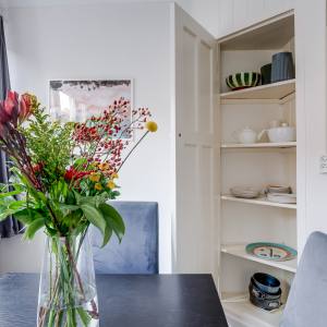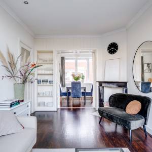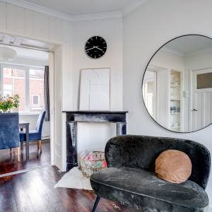 Through your private front door, you reach the staircase to the first floor. You enter onto the landing, where you have immediate access to the living areas. At the front you’ll find the atmospheric dining room, ideal for long dinners or a cozy workspace by the window. The original en-suite layout with stained glass and classic panel doors forms a beautiful connection to the bright living room at the rear, where the natural stone mantelpiece immediately catches the eye and adds extra character.