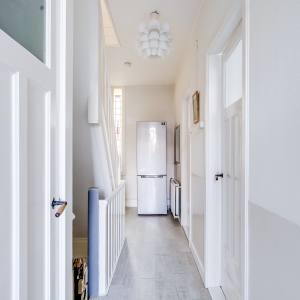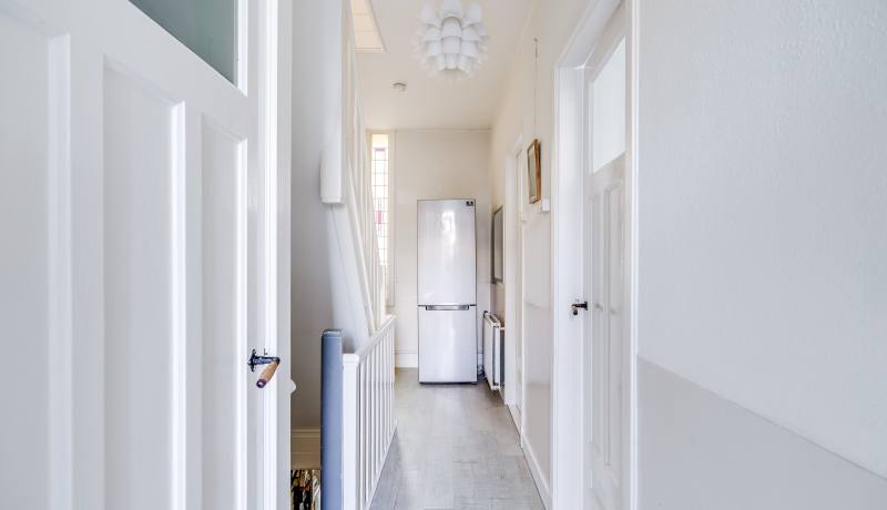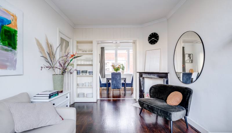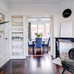 Via de eigen voordeur bereik je de trapopgang naar de eerste verdieping. Je komt binnen op de overloop, waar je links direct toegang hebt tot de leefruimtes. Aan de voorzijde bevindt zich de sfeervolle eetkamer, ideaal voor lange diners of een gezellige werkplek aan het raam. De originele kamer-en-suite met glas-in-lood en klassieke paneeldeuren vormt een prachtige verbinding met de lichte woonkamer aan de achterzijde, waar de natuurstenen schouw direct in het oog springt en de ruimte extra karakter geeft.