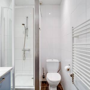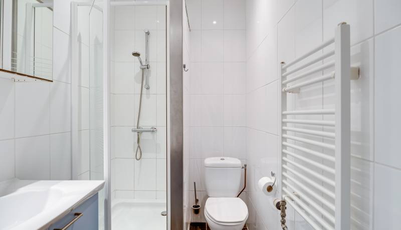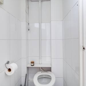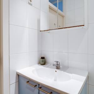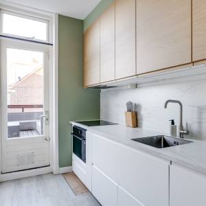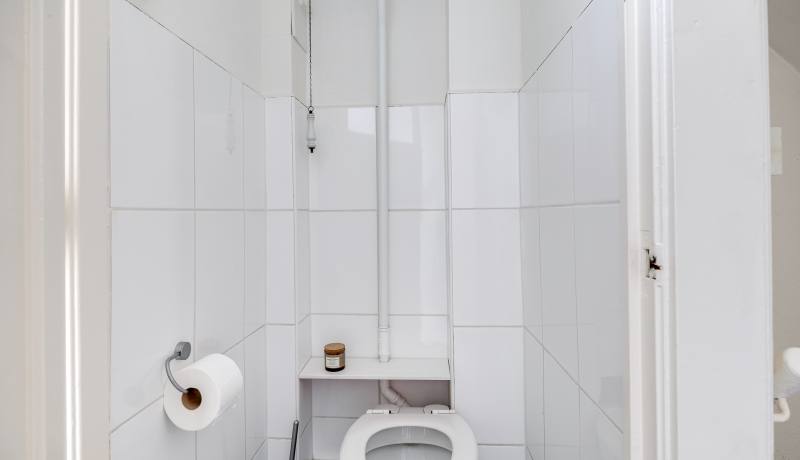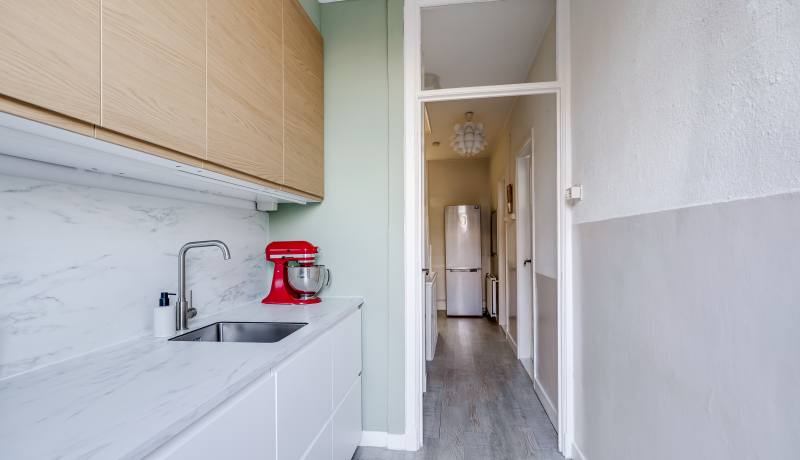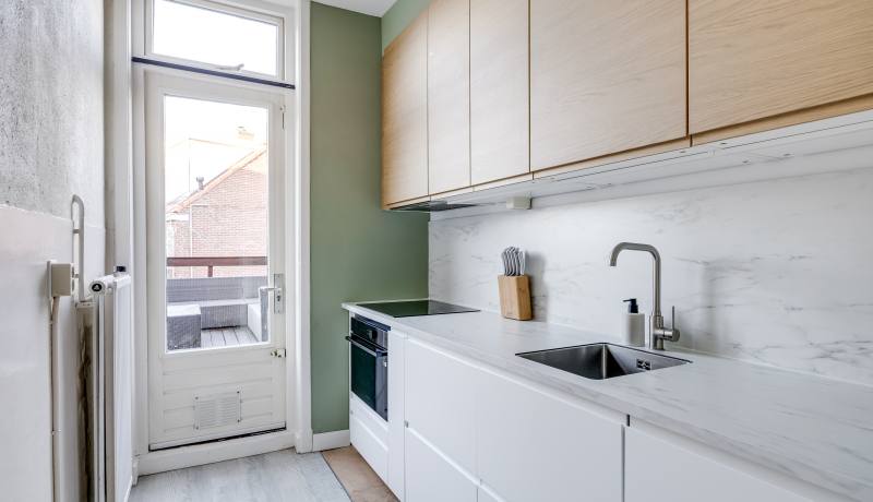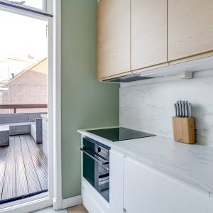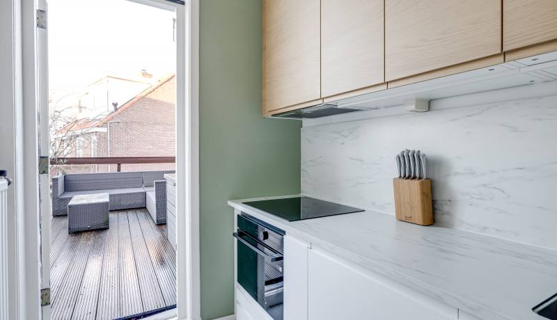 Continuing down the landing, you will find the separate toilet, and at the end of the hallway is the kitchen. Fully renewed in 2025, the kitchen is equipped with modern built-in appliances including an induction hob, combi oven, extractor hood, and dishwasher. From here, you have direct access to the spacious roof terrace, an extension of your living space perfect for enjoying the outdoors.