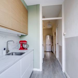 Loop je de overloop verder door, dan vind je het separate toilet, en aan het einde van de gang ligt de keuken. Deze is in 2025 volledig vernieuwd en uitgerust met modern inbouwcomfort, waaronder een inductiekookplaat, combi-oven, afzuigkap en een vaatwasser. Vanuit de keuken heb je directe toegang tot het ruime dakterras, een echt verlengstuk van je leefruimte.