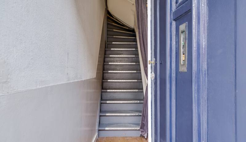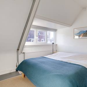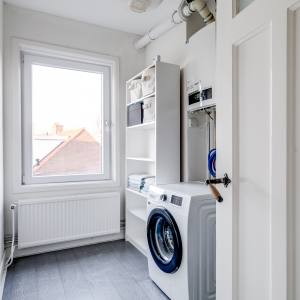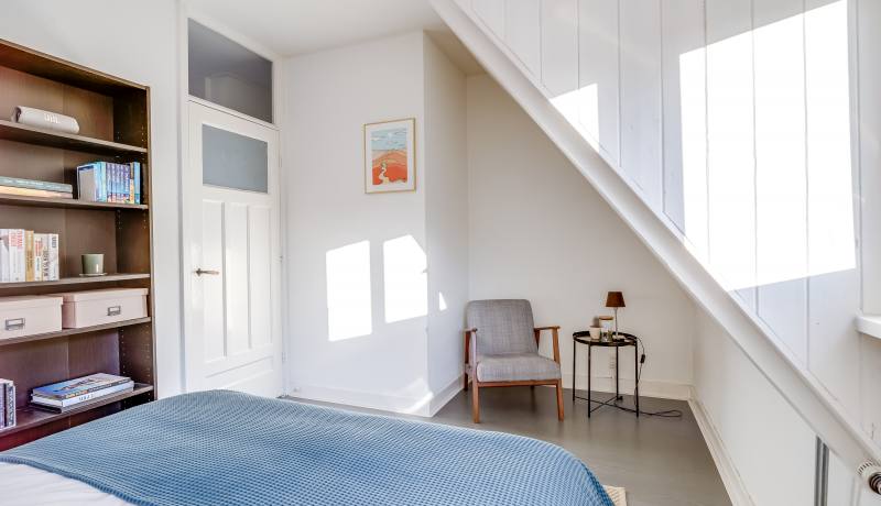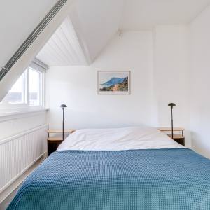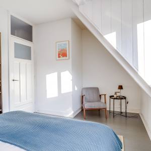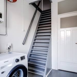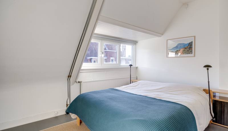 The second floor offers two pleasant bedrooms. The largest bedroom is situated at the front and features a dormer, giving the room extra space and light. Authentic details such as the wooden floor and high ceiling are particularly striking here. At the rear, you'll find the second bedroom. This floor also includes the bathroom with toilet, shower, and washbasin, as well as a separate storage area with a washing machine connection. A fixed staircase leads to the top floor.