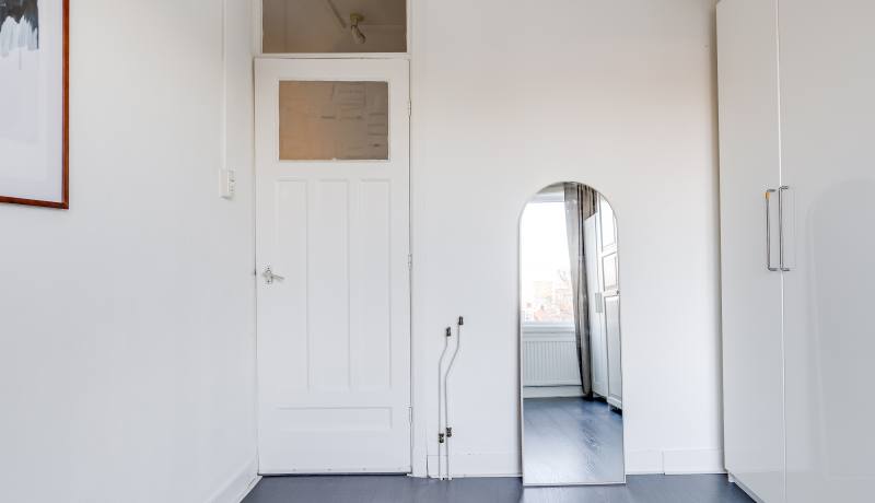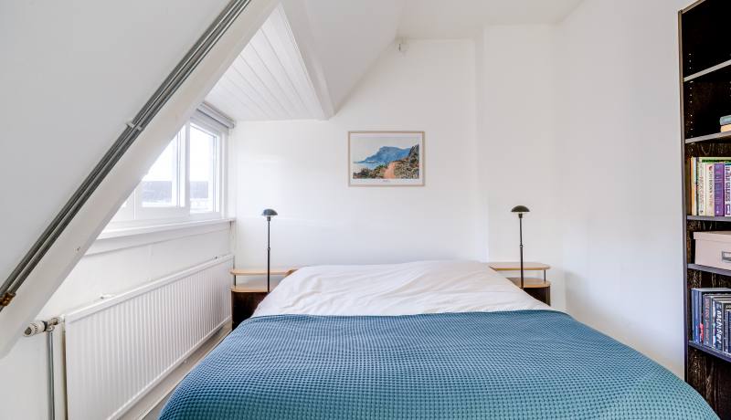 De tweede verdieping biedt twee fijne slaapkamers. Aan de voorzijde ligt de grootste slaapkamer, voorzien van een dakkapel, waardoor de kamer extra ruim en licht aanvoelt. Authentieke details zoals de houten vloer en het hoge plafond komen hier mooi tot hun recht. Aan de achterzijde bevindt zich de tweede slaapkamer. Verder vind je hier de badkamer, compleet met toilet, douche en wastafel, en een aparte ruimte voor berging met een wasmachineaansluiting. Vanuit deze verdieping leidt een vaste trap naar de bovenste etage.