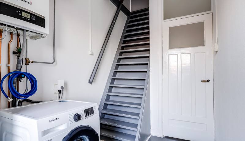 - Tweede verdieping: Overloop, twee slaapkamers (waarvan één met dakkapel), badkamer met toilet, douche en wastafel, berging met wasmachineaansluiting, vaste trap naar zolder.
