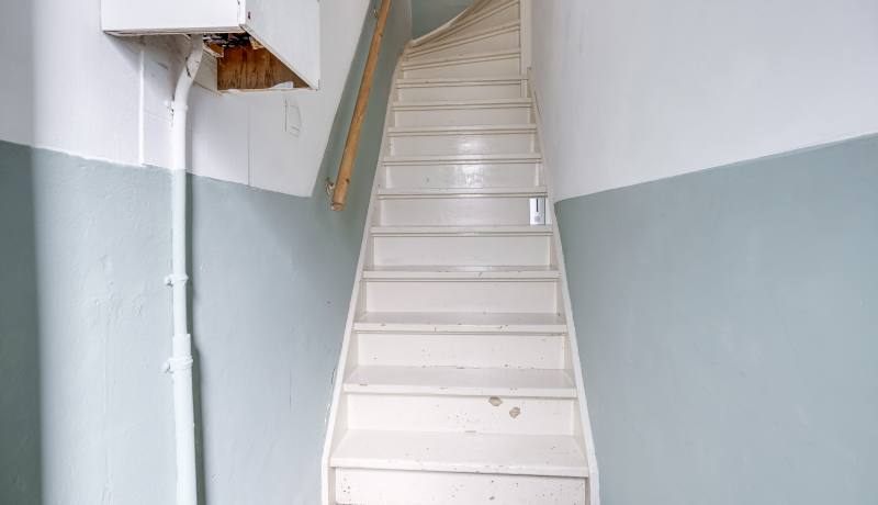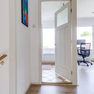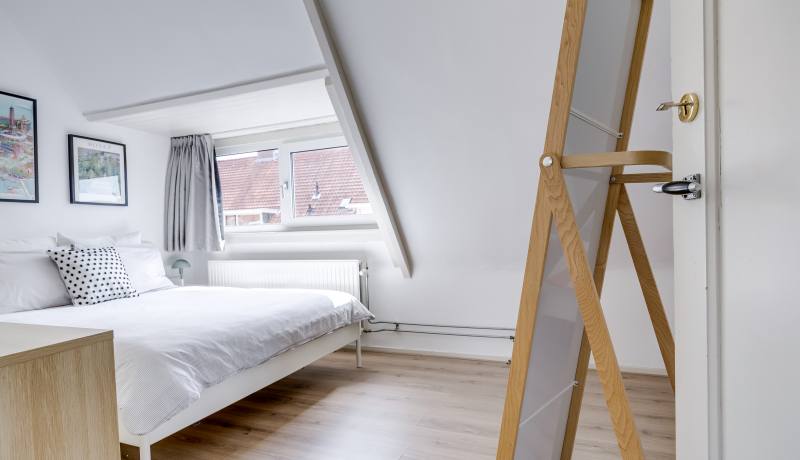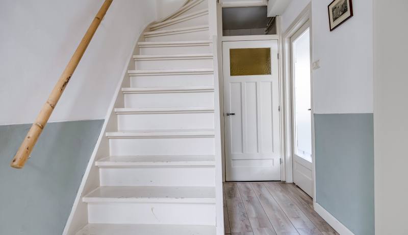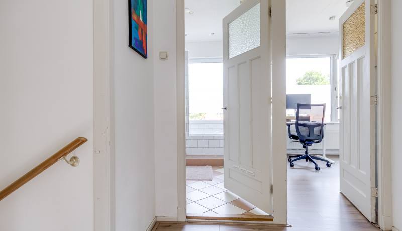 Through your own front door and staircase, you reach the first floor. Here you’ll find a bright living room with large front windows overlooking the street. At the rear lies the open kitchen (2012, partly updated). From the kitchen you step directly onto the sunny roof terrace – the perfect place to fully enjoy outdoor living. This floor also includes a hallway with staircase and a separate toilet.