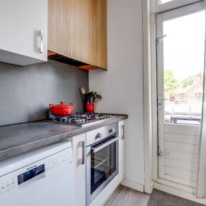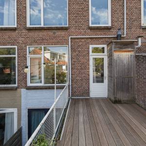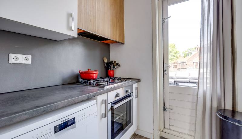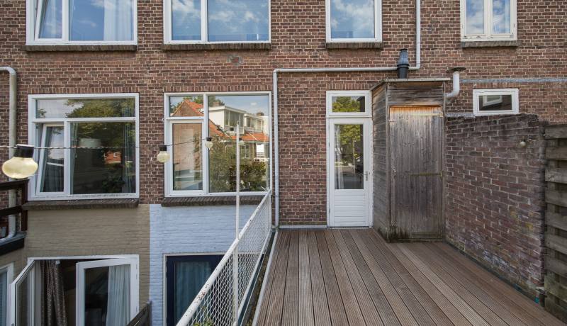 Via je eigen voordeur en trapopgang kom je op de eerste verdieping. Hier vind je een lichte woonkamer met grote ramen aan de voorzijde, waar je fijn uitkijkt over de straat. Aan de achterzijde ligt de open keuken (2012, deels vernieuwd). Vanuit de keuken stap je direct het zonnige dakterras op – dé plek om volop te genieten van het buitenleven. Verder is er op deze verdieping een overloop met trapopgang en een separaat toilet.