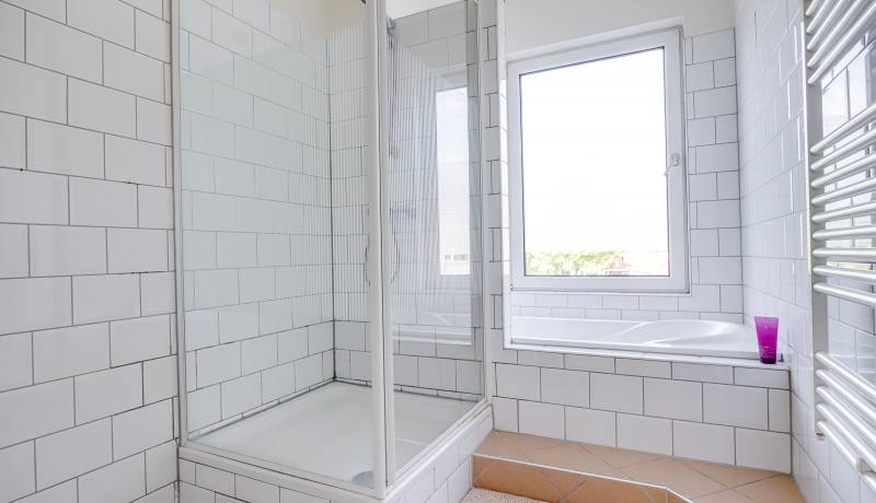 The second floor offers two spacious bedrooms, the larger one featuring a dormer window. You’ll also find a convenient landing closet with washing machine connection and the bathroom. The bathroom (2012) is fully equipped with a bathtub, shower, and sink. On the third floor, there is a third bedroom.