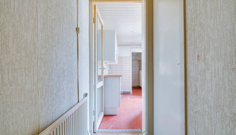 Entree/hal, woonkamer met openslaande deuren naar de 17 meter diepe tuin op het Zuiden, de keuken zit in de uitbouw evenals het toilet, trapopgang naar