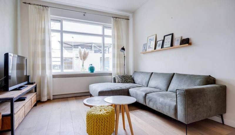 Spacious entrance/hall, neat and sleek toilet room with sink, access to the basement and the meter cupboard. From the hall access to the spacious living room with beautiful floor and high ceilings of almost 3 meters. At the rear is the bright dining room, with French doors to the backyard. The kitchen is equipped with various built-in appliances, such as dishwasher, oven and 5-burner gas stove, extractor hood, refrigerator with freezer. There is also access to the beautifully landscaped backyard from the kitchen.