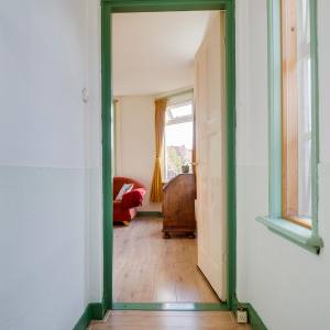Via de gezamenlijke en nette open portiek kom je met de trap bij het appartement op de eerste verdieping. De indeling is als volgt: brede ruime hal met rechts de meterkast en de toiletruimte voorzien van toilet en fonteintje, tegenover de voordeur zit de keuken met daarin ook de douchecabine en elektrische huurboiler. Aan de straatkant rechts zit de eerste (slaap)kamer met toegang tot het fijne balkon welke is gelegen op het Zuidwesten. Vanuit de hal kom je in de ruime en lichte woonkamer. Door de ligging op de hoek en de vele ramen is dit een hele fijne ruimte. Achter de woonkamer zit nog een tweede (slaap)kamer welke ook goed te gebruiken is als werk- of eetkamer.