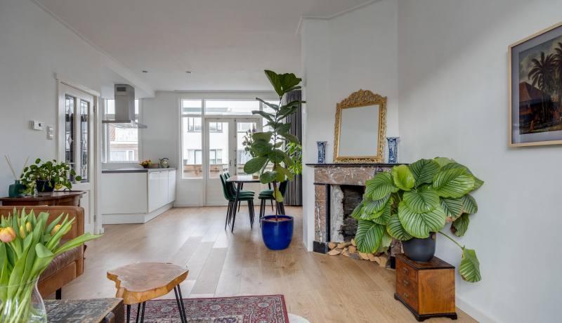 ruime en lichte woonkamer met mooie laminaatvloer, originele schouw en openslaande deuren naar het zonnige dakterras, moderne open keuken voorzien van diverse inbouwapparatuur, keurige badkamer met douche en wastafel, trapopgang naar