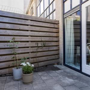 Door de openslaande deuren trek je de tuin in de zomer op een leuke manier bij de woonkamer. Verder is de vrijstaande berging erg praktisch, er is voldoende ruimte voor je fietsen en er zijn wandplanken. De schuur is voorzien van elektra. Deze berging en de achtertuin zijn ook via een afgesloten achterom te bereiken.