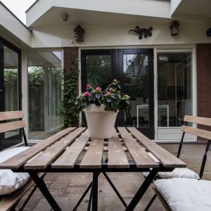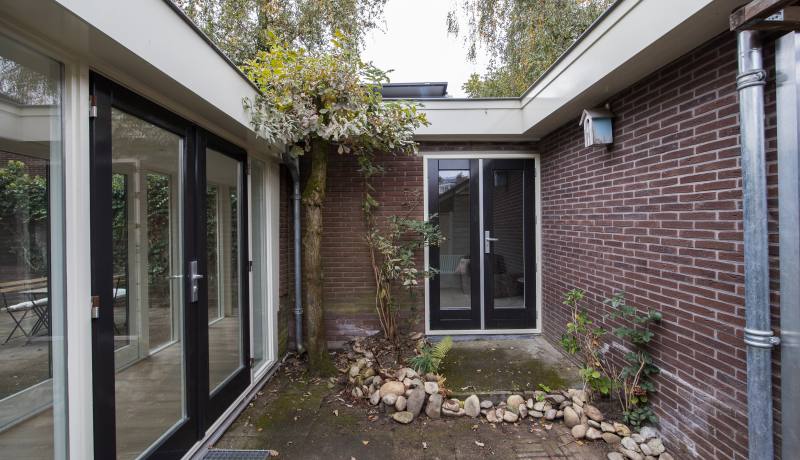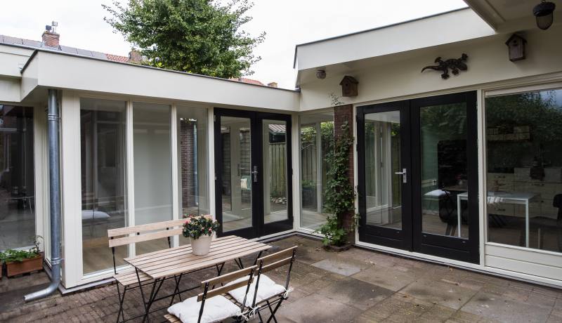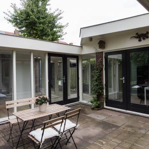 At the rear is the modern open kitchen, equipped with various built-in appliances, ample storage, and a generous worktop. The kitchen is tidy and well-maintained, ideal for anyone who enjoys cooking. From here, you reach the covered walkway (droogloop), which connects to the secluded patio, a private, walled outdoor space where you can relax in peace, even on less sunny days.