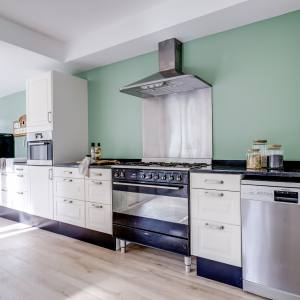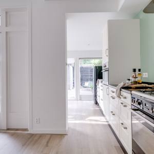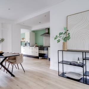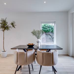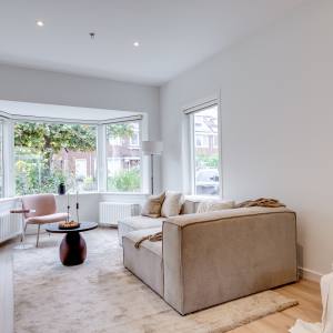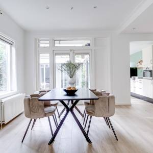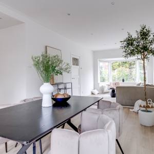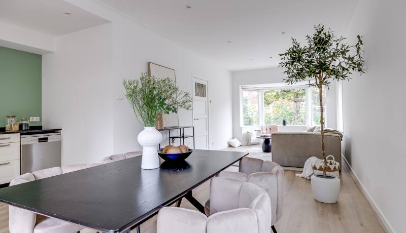 You enter through the charming hallway featuring original details and the staircase to the first floor. At the front of the house is a bright living room with large windows and a stylish bay window, creating a cosy sitting area and space for a dining table.