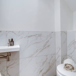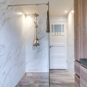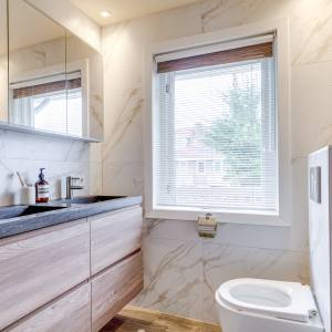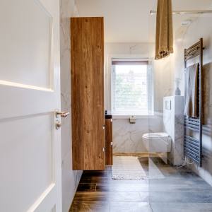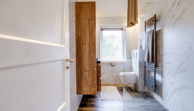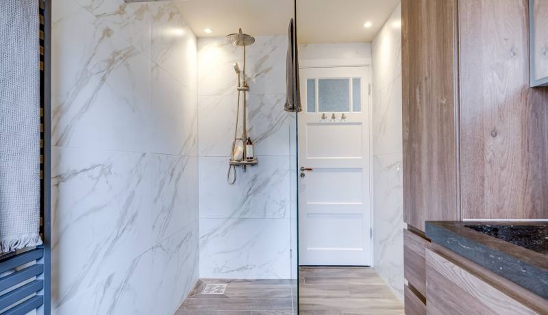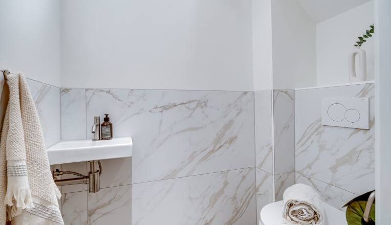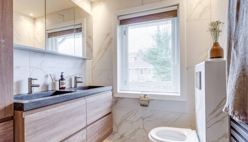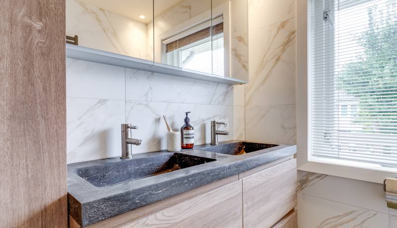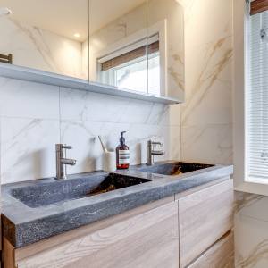 The modern bathroom (2024) is fitted with a walk-in shower, double washbasin, and toilet, finished with high-quality materials in a timeless design.