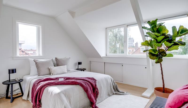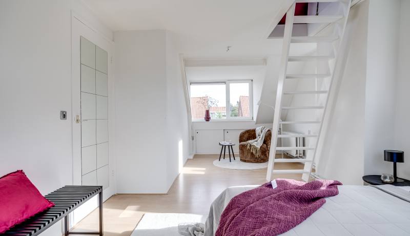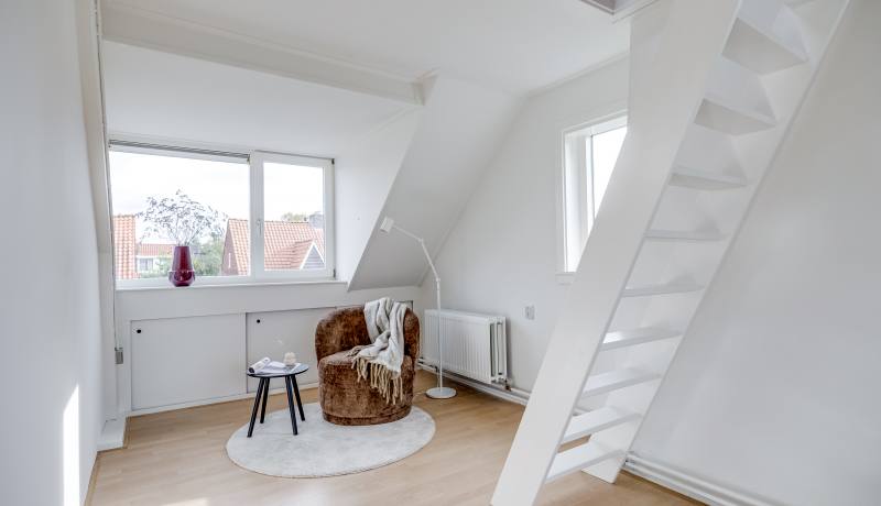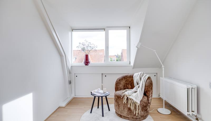De tweede verdieping heeft een overloop met wasmachineaansluiting en nog twee slaapkamers. De grootste kamer is royaal en voorzien van dakkapellen aan beide zijden, wat zorgt voor veel licht en ruimte. Vanuit deze kamer is er tevens toegang tot de vliering voor extra bergruimte. Van deze ruime kamer is het ook zeker mogelijk om nog een extra slaapkamer te creëren.