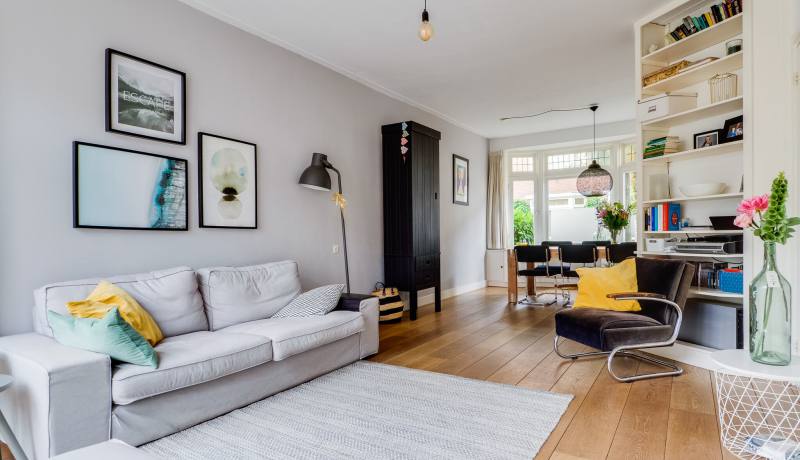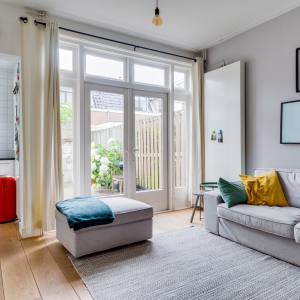 Entree/hal met meterkast, modern toilet met fonteintje, lichte woonkamer met fraaie houten vloer en openslaande deuren naar de ruim 6 meter diepe tuin, moderne half-open keuken voorzien van diverse inbouwapparatuur met deur naar de tuin