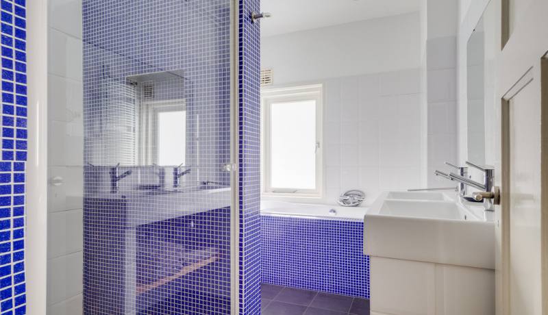 Overloop, ruime bergkast, twee flinke slaapkamers en moderne badkamer voorzien van dubbele wastafel, 2e toilet, ligbad en inloopdouche, trapopgang naar