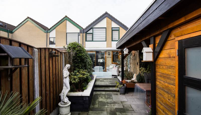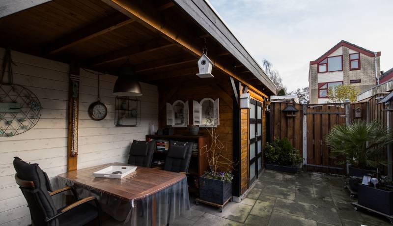 Vanuit de keuken stap je via de schuifpui zo de serre in en een fijne buitenruimte waar je heerlijk kunt zitten, eten of ontspannen. In de tuin bevinden zich bovendien twee externe bergingen, ideaal voor fietsen, gereedschap of extra opslag.