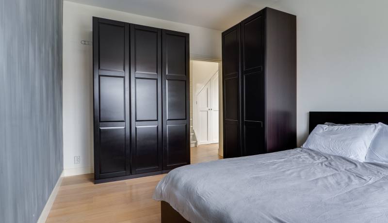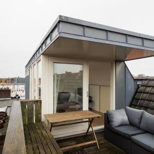 Lichte slaap-/werkkamer met riante ingebouwde opbergruimte (achter knieschotten) en schuifpui naar het heerlijke dakterras met een fraai uitzicht.