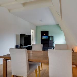 Overloop met toegang tot het toilet en kleine slaap-/studeerkamer. Ruime woonkamer met hoge nok en veel lichtinval door de hoekligging. Moderne, open keuken met kookeiland en voorzien van gaskookplaat, afzuigkap, koelkast, vriezer, combi-magnetron en vaatwasser. Tweede hal met ruime trapkast en toegang tot moderne badkamer met douche, wastafelmeubel, 2e toilet en wasmachineaansluiting. Ruime, rustig gelegen hoofdslaapkamer aan de achterzijde.