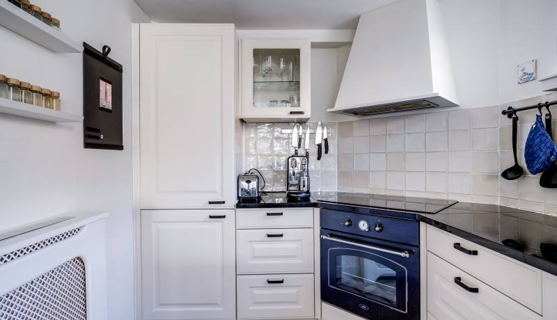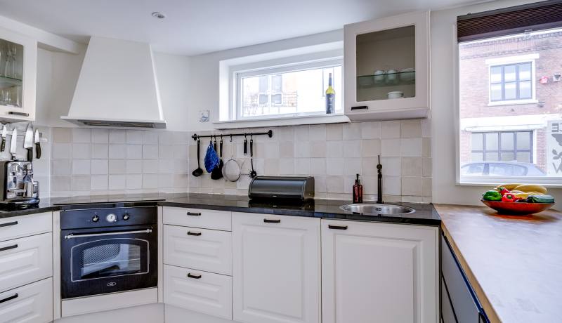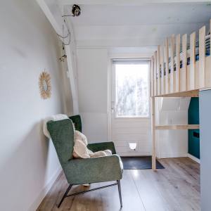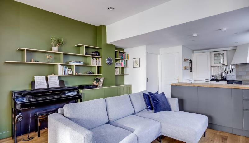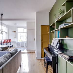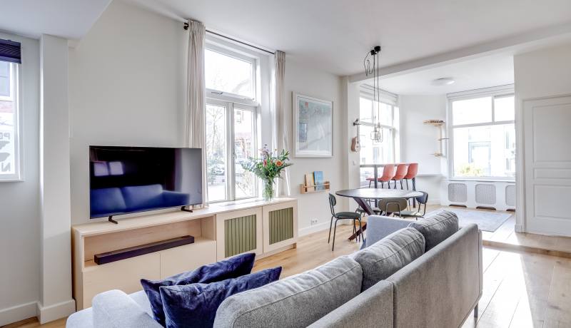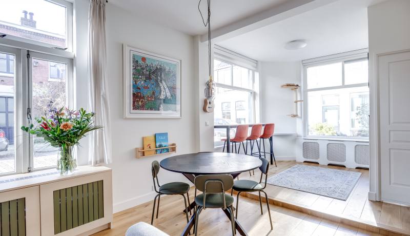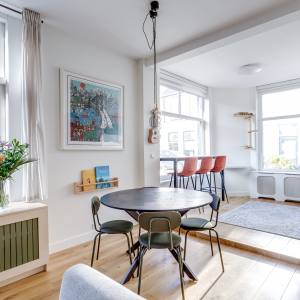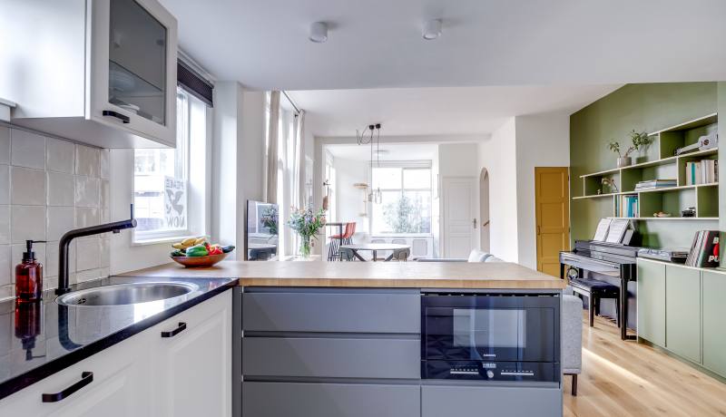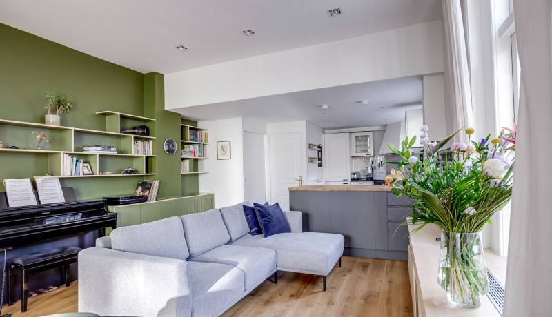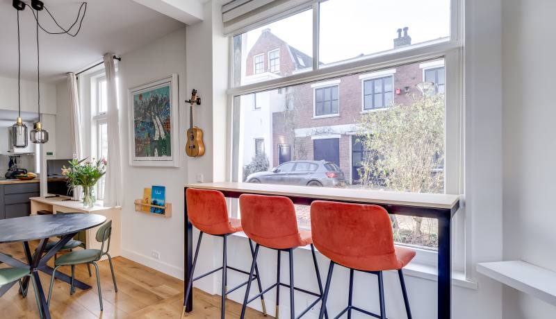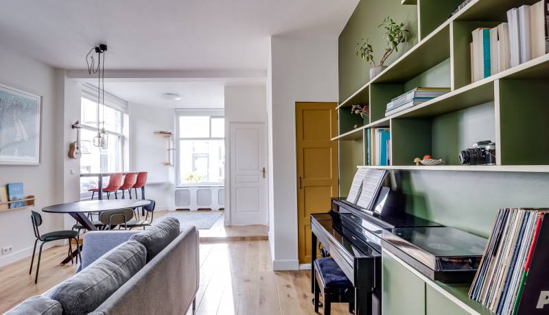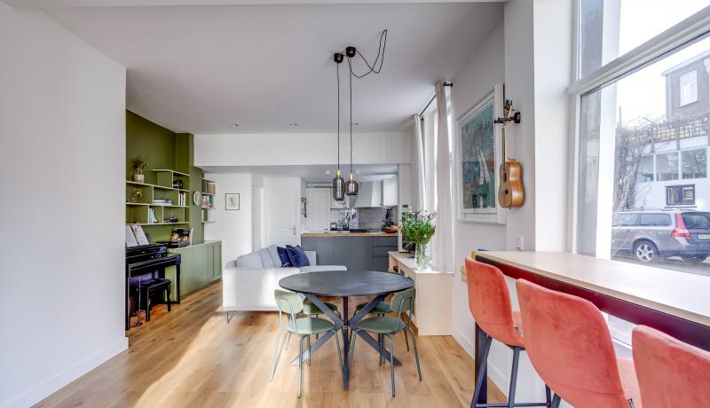 You enter the property on the ground floor into a surprisingly pleasant living space. The living room is wonderfully bright and offers ample room for both a comfortable seating area and a dining table. The layout feels open and practical, making it a great place to truly live and relax. The bespoke built-in furniture on both sides of the living room adds extra comfort, storage space and a sleek appearance. At the rear you’ll find the open kitchen, a great spot to cook while staying connected with the rest of the room.