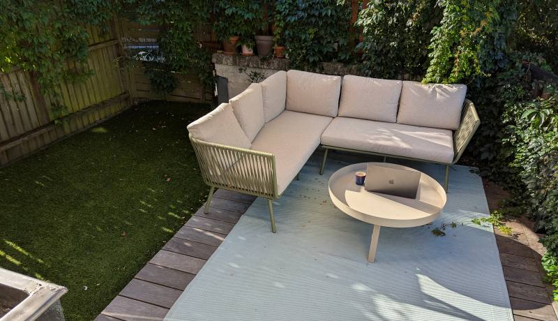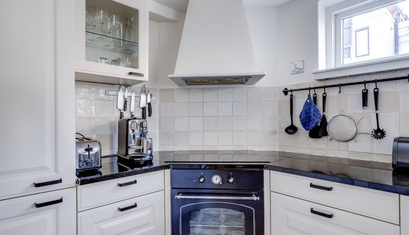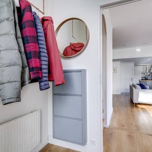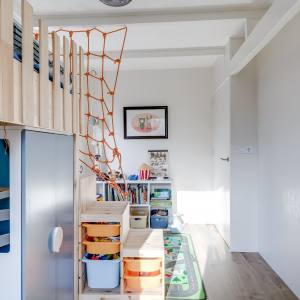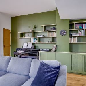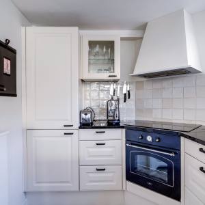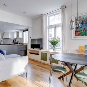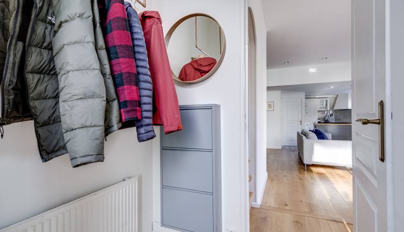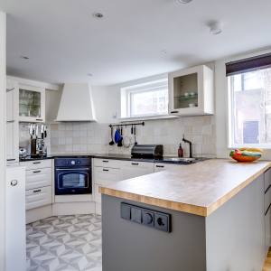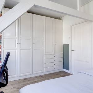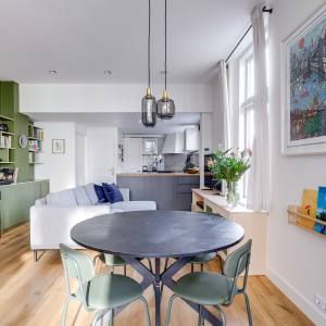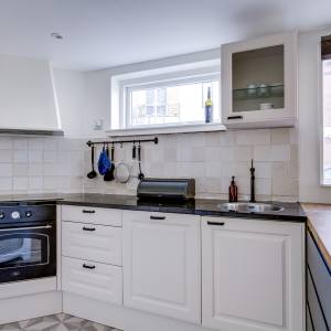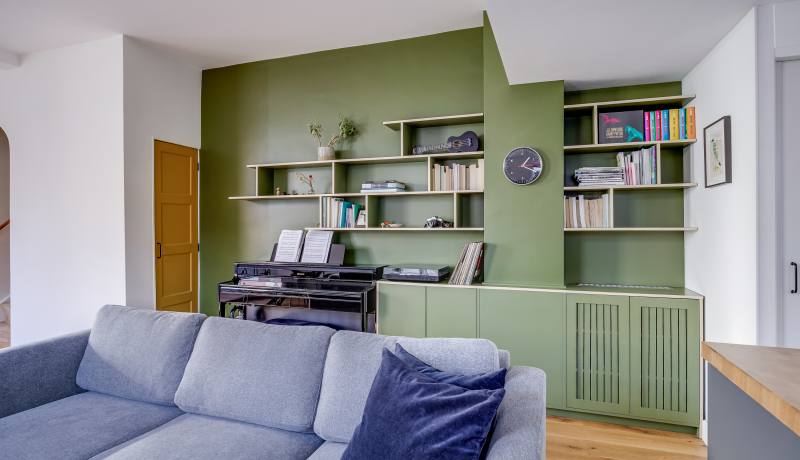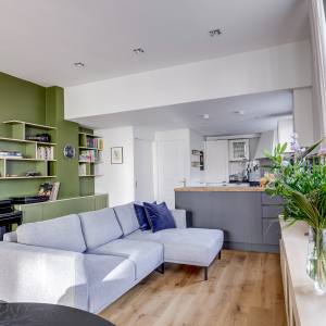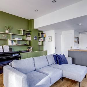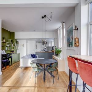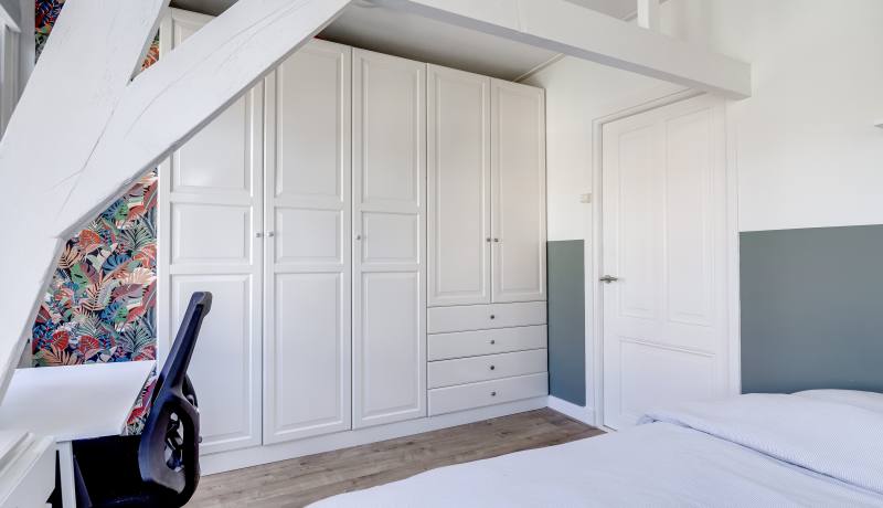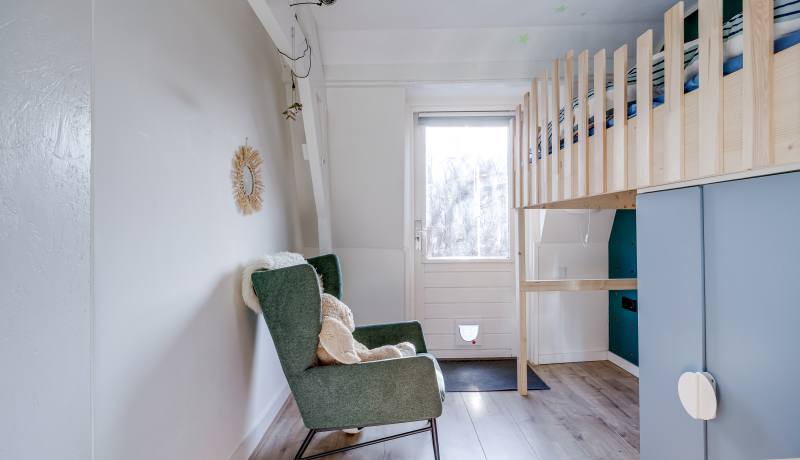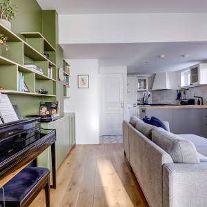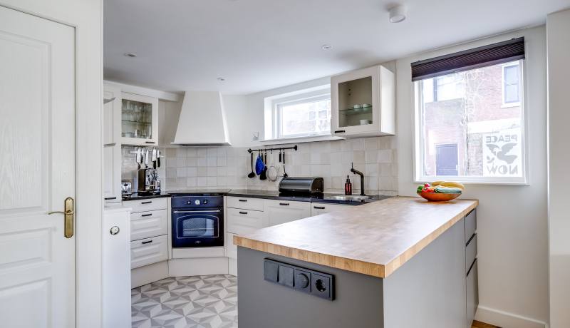 You enter the property on the ground floor into a surprisingly pleasant living space. The living room is wonderfully bright and offers ample room for both a comfortable seating area and a dining table. The layout feels open and practical, making it a great place to truly live and relax. The bespoke built-in furniture on both sides of the living room adds extra comfort, storage space and a sleek appearance. At the rear you’ll find the open kitchen, a great spot to cook while staying connected with the rest of the room.
