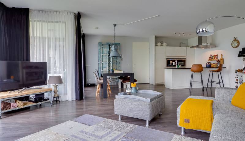 De woonkamer is erg ruim en speels door de schuine wand. Door de vele ramen is hier veel licht en een fijne plek om te zijn. De open keuken is modern en van alle gemakken voorzien zoals, vaatwasser, koffiezetapparaat, combi oven/magnetron, koel/vriescombinatie, inductiekookplaat en veel kastruimte.