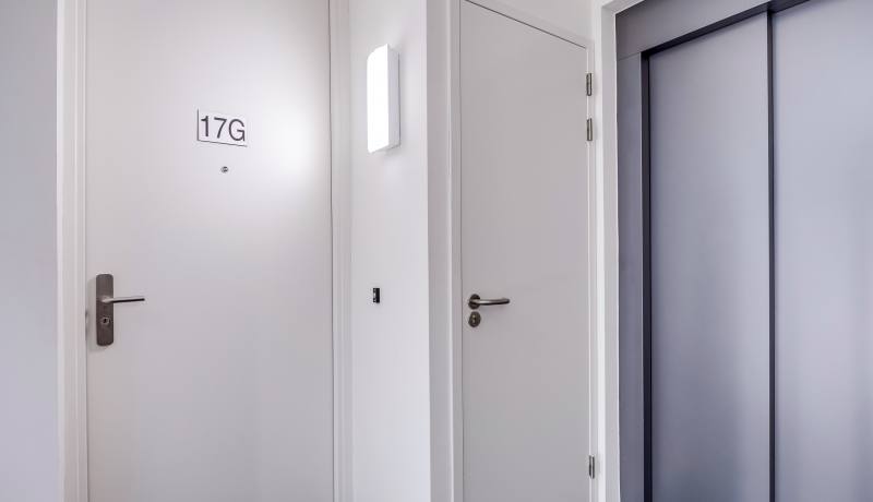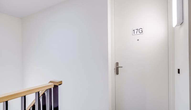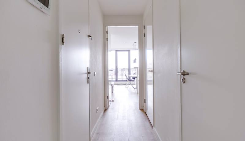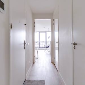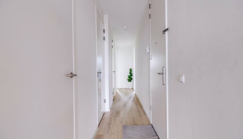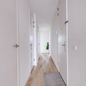 Nette en goed onderhouden gezamenlijke entree met toegang tot het trappenhuis, de lift en de ondergelegen parkeergarage. Bij het appartement hoort tevens een parkeerplaats in de parkeergarage, welke separaat te koop is tegen meerprijs. De entree van het appartement leidt naar een centrale hal die toegang biedt tot alle vertrekken. Het appartement heeft een praktische en logische indeling en is volledig voorzien van vloerverwarming en zonne-energie voor individueel gebruik per appartement, wat zorgt voor een prettig en comfortabel woonklimaat. Aan de rechterzijde van het appartement bevinden zich twee comfortabele slaapkamers, rustig gelegen en van goed formaat.