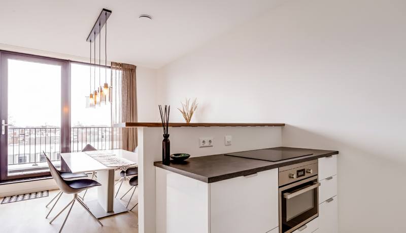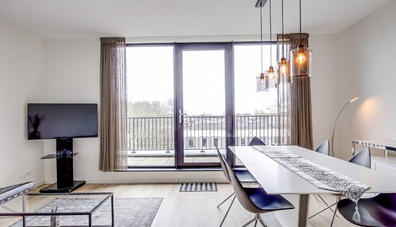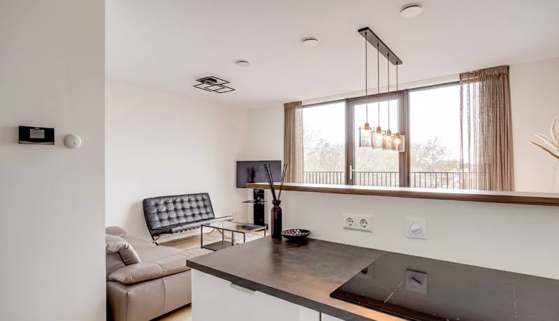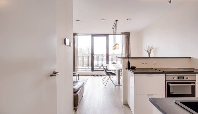 Aan de linkerzijde ligt het leefgedeelte van het appartement. De royale woonkamer vormt hier het hart van de woning en staat in open verbinding met de moderne keuken en het eetgedeelte. Dankzij de grote raampartijen is het hier heerlijk licht en heb je een fijne connectie met buiten. Vanuit de woonkamer stap je direct het balkon van ca. 8,3 m² op, een heerlijke plek voor je ochtendkoffie of een borrel aan het eind van de dag.