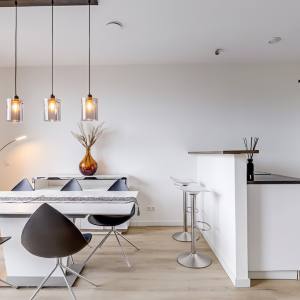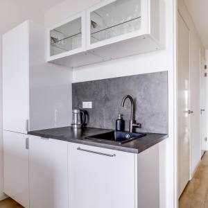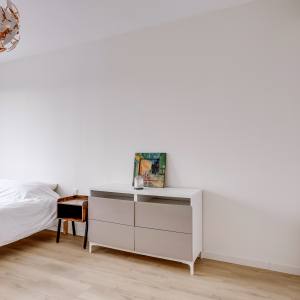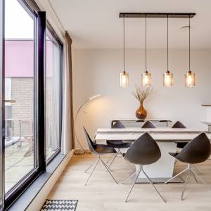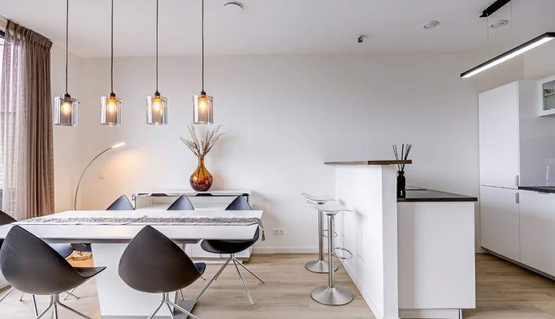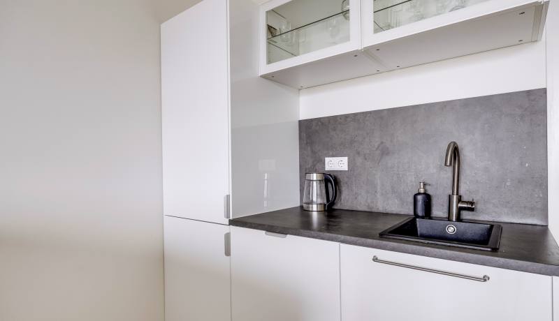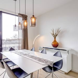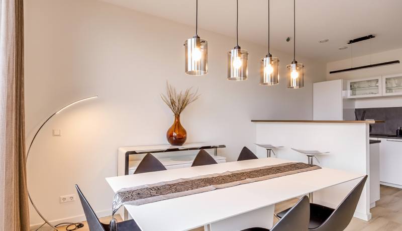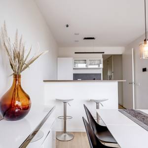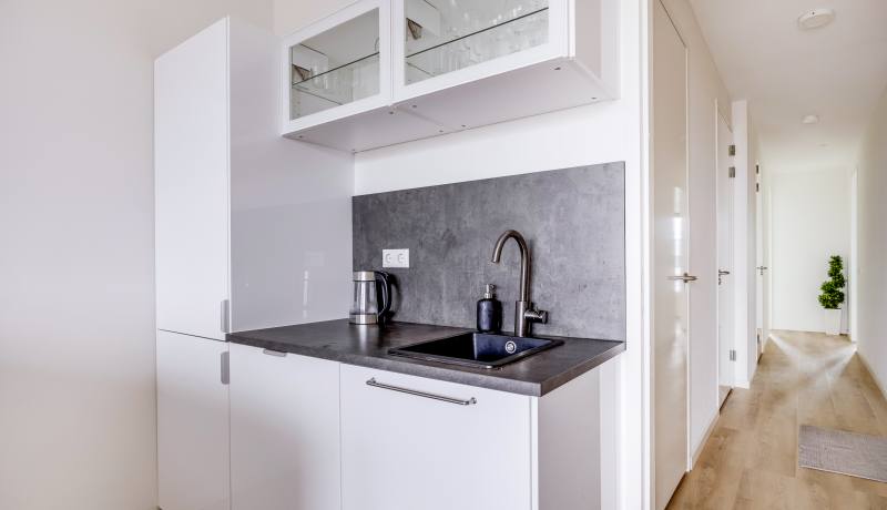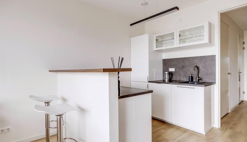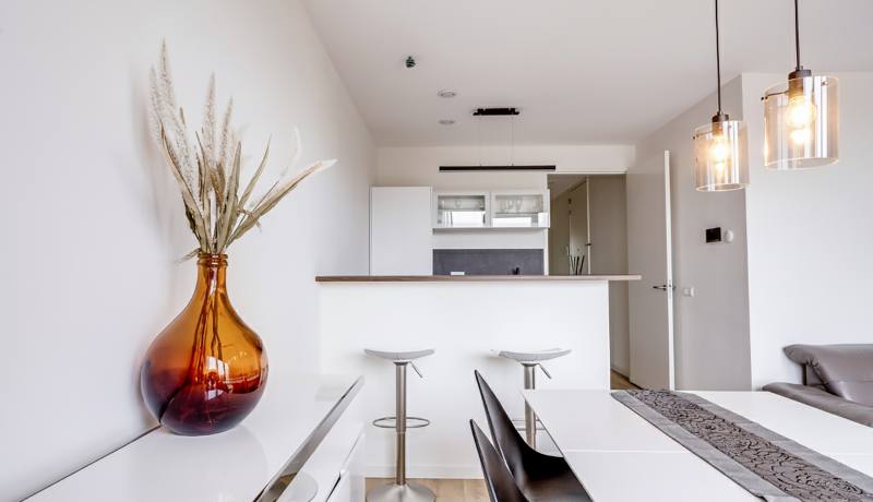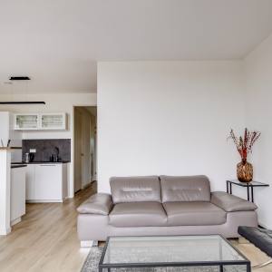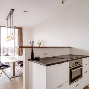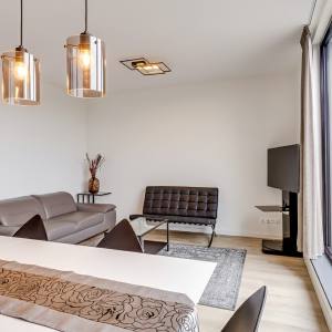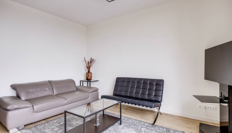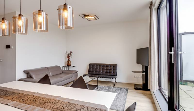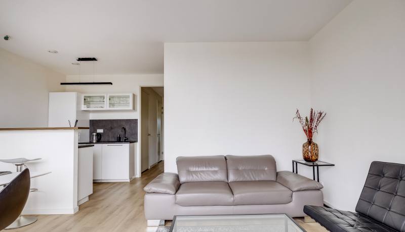 On the left-hand side of the apartment is the living area. The spacious living room forms the heart of the home and is openly connected to the modern kitchen and dining area. Thanks to the large windows, the space is filled with natural light and enjoys a strong connection with the outdoors. From the living room, you step directly onto the balcony of approximately 8.3 m², a lovely spot for your morning coffee or an evening drink.