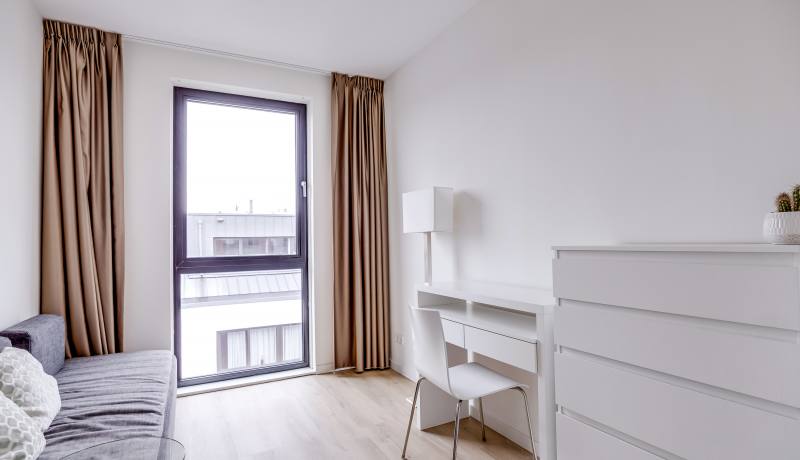 - Vierde verdieping: entree, centrale hal, twee slaapkamers, woonkamer met eetgedeelte en open keuken, balkon, berging met wasmachineaansluiting, separaat toilet en badkamer met douche, ligbad en wastafel.