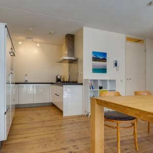 Toegang tot de eetkamer met open keuken. Keuken is voorzien van inbouwapparatuur zoals oven, koelkast, vriezer, vaatwasser, 5-pits gasfornuis en afzuigkap. Door de vide is er een leuk en speels contact met de woonkamer die iets lager ligt. De woonkamer en eetkamer zijn beiden erg licht door de grote raampartijen. De woonkamer heeft bijna een hoogte van 4 meter! Alle wanden zijn netjes afgewerkt.