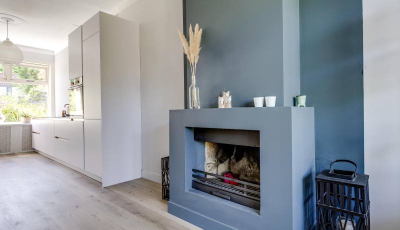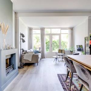 Through the front garden and the distinctive front door, you enter a neat hallway with a beautiful floor, where you’ll find the staircase and the modernized toilet. The home exudes light and space. At the front is the modern open-plan kitchen, fully renewed in 2019 and equipped with all modern conveniences, including built-in appliances and a luxurious Quooker tap – perfect for instant boiling water. A large front window allows plenty of natural light to fill the space, creating a pleasant atmosphere while cooking.