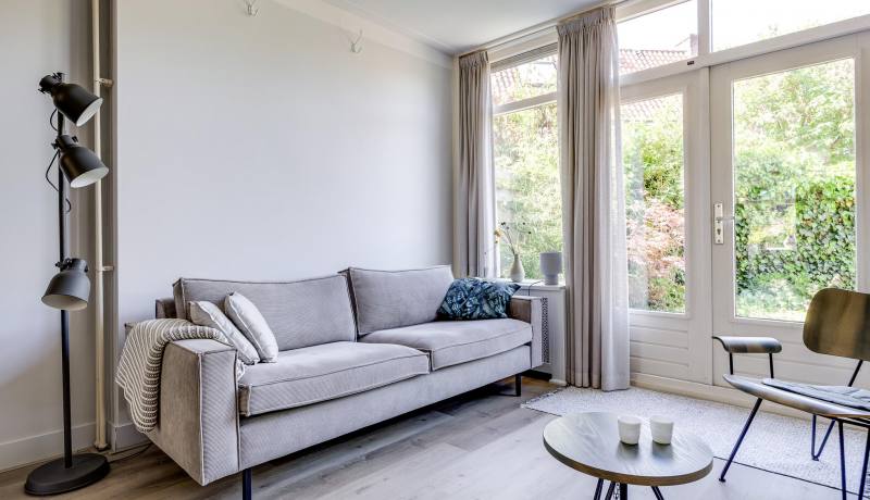 De keuken loopt naadloos over in de lichte woonkamer aan de achterzijde van de woning. Hier zorgt een pvc vloer (met houtmotief) voor een gezellige uitstraling, en de openslaande deuren aan de achterzijde voegt extra karakter én daglicht toe aan de ruimte. Vanuit de woonkamer heb je direct toegang tot de diepe, fraai aangelegde achtertuin. Deze zonnige tuin is een heerlijke plek om te ontspannen, te tuinieren of buiten te eten. Het terras, de groene borders en het vele groen creëren een fijne, rustgevende sfeer. Aan de zijkant van de woning bevindt zich een schuur van circa 6 m2; perfect voor het stallen van fietsen of het opbergen van tuinmeubilair.