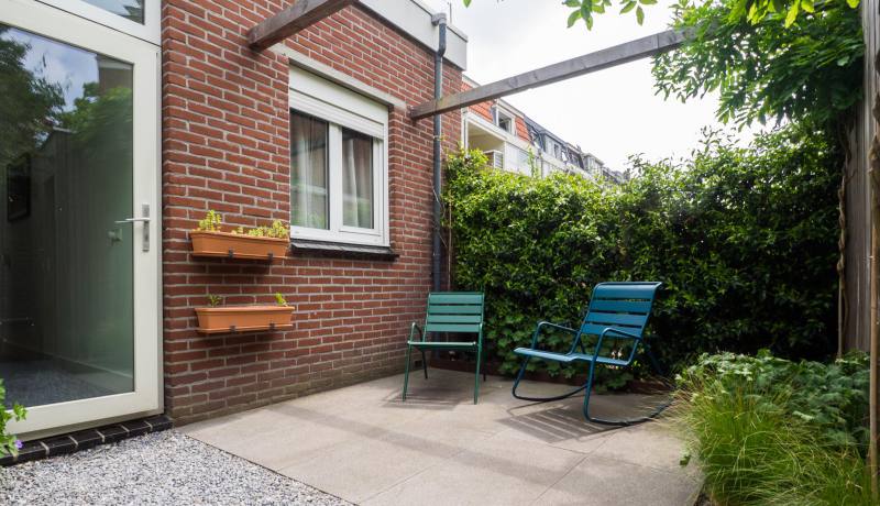 De zonnige tuin met achterom heeft een buitenkraan en ruime berging met aansluiting voor elektra.