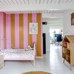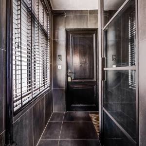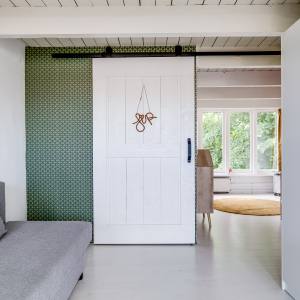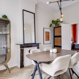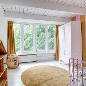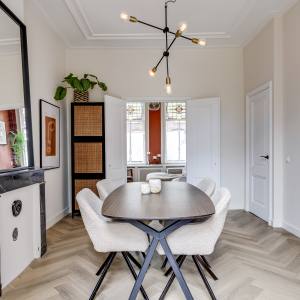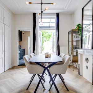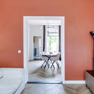 The home greets you with a classic front door featuring stained-glass details. Inside, the atmosphere immediately comes to life in the bright living room, adorned with beautiful ensuite doors, high ceilings with original ornaments, and a herringbone wooden floor. The blend of authentic and contemporary elements gives the house both character and comfort.