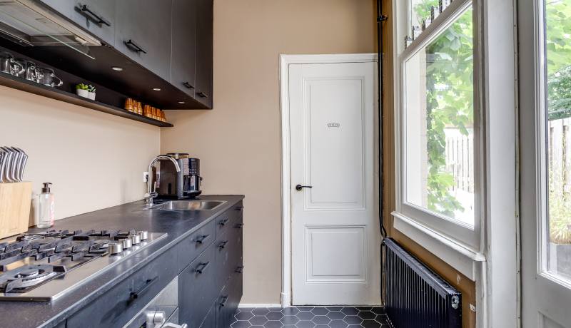 Aan de achterzijde ligt de keuken (2016) een heerlijke plek om te koken en te genieten van de geweldige eetkamer. Via de openslaande deuren stap je de fraaie stadstuin in, waar je in de ochtend rustig kunt ontbijten of lekker kunt ontspannen in de middag- en avondzon. Achter de keuken bevindt zich het toilet.