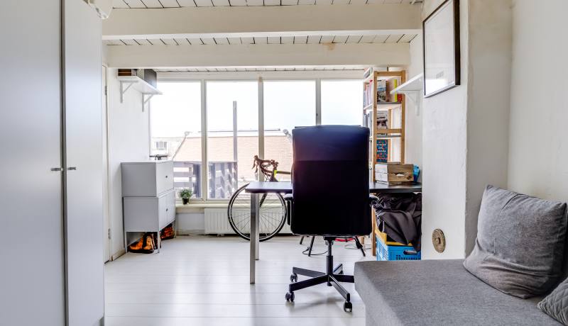 De zolderverdieping is bereikbaar via een vaste trap en biedt nog eens ca. 37 m² extra ruimte. Hoewel deze volgens de NEN2580-norm formeel niet tot de woonoppervlakte wordt gerekend vanwege de daklijn, is het in de praktijk een volwaardige verdieping. Hier bevinden zich twee slaapkamers, een berging en toegang tot het ruime dakterras. Een zonnige plek om te loungen, tuinieren of genieten van de stadse sfeer boven de gezellige straten van Lombok.