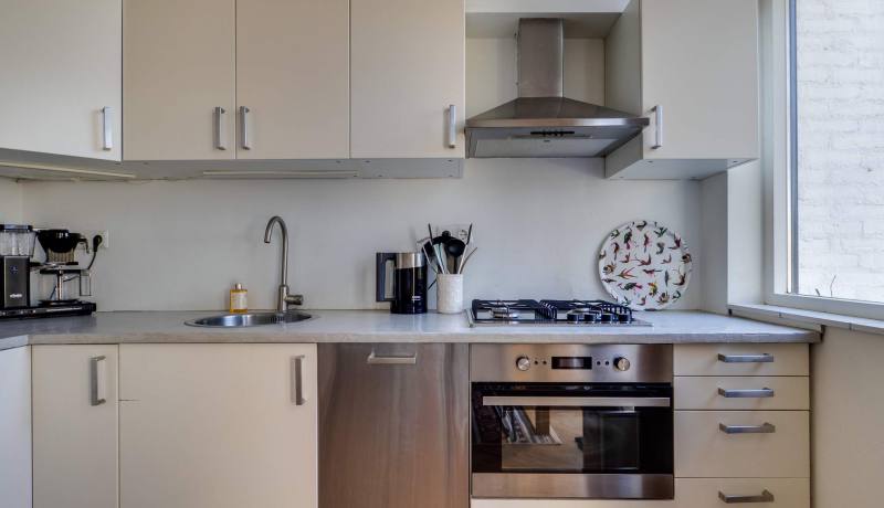 De woonkamer is bijzonder licht door de grote raampartijen, zowel voor als achter. Er hangt hier een mooie sfeer onder andere vanwege de balken in het zicht. De houtenvloer (grenen) is schuin gelegd en de wanden zijn netjes afgewerkt. Aan de achterzijde heb je de eetkamer met open keuken. Hier heb je plek voor een ruime tafel en sta je in contact met de keuken. De keuken is netjes en voorzien van een gaskookplaat, oven, koelkast, vriezer, vaatwasser en veel werkruimte.