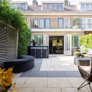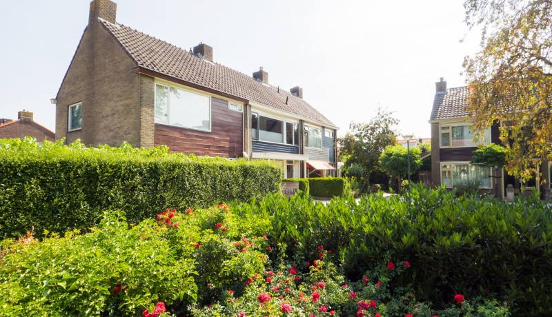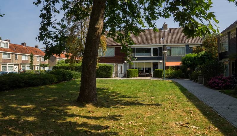 Voortuin, entree woning, hal, trapkast onder de trap, modern zwevend toilet. Uitgebouwde woonkamer met openslaande deuren naar de zonnige en diepe tuin van ca. 9,3 x 5,7 meter. De tuin beschikt over een vrijstaande stenen berging, een overkapte lounge-hoek naast de berging én een achterom.