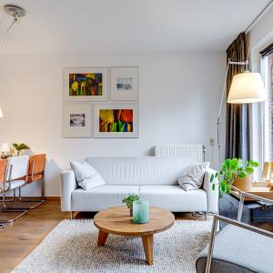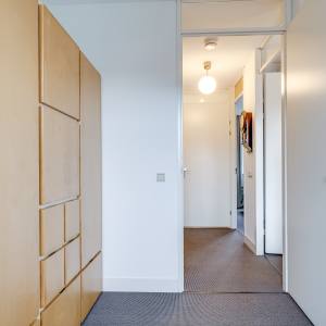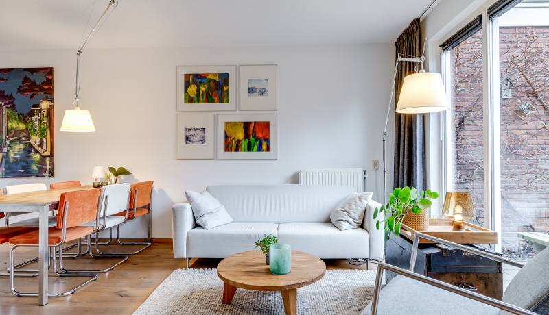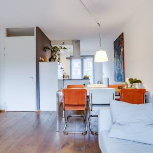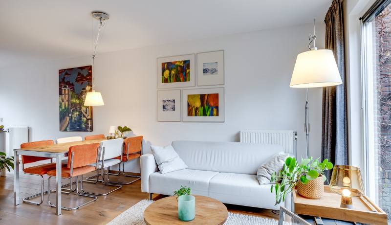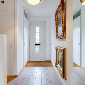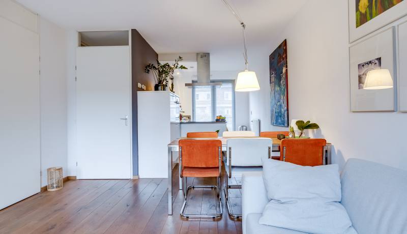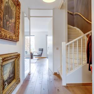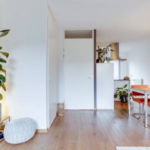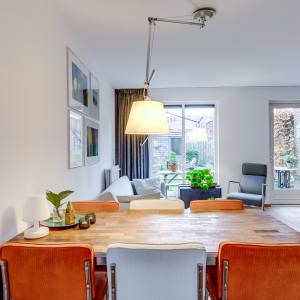 You enter through the front garden into the hallway, where you’ll find the toilet and the staircase to the upper floors. From the hallway, you walk into the spacious and bright living room. The seating area is located at the garden side, while the dining area is positioned towards the kitchen. Large windows bring in plenty of daylight and create a relaxed atmosphere.