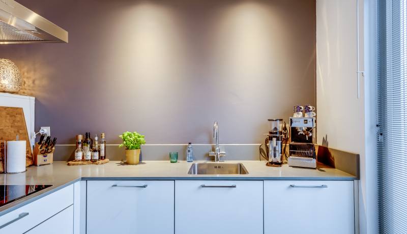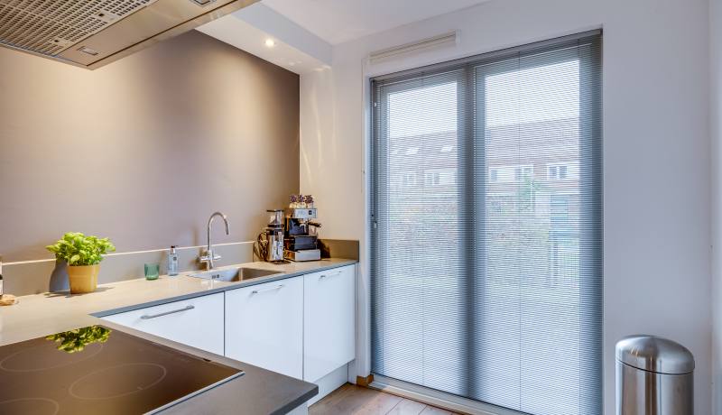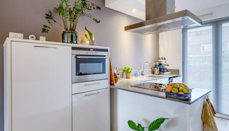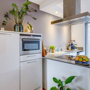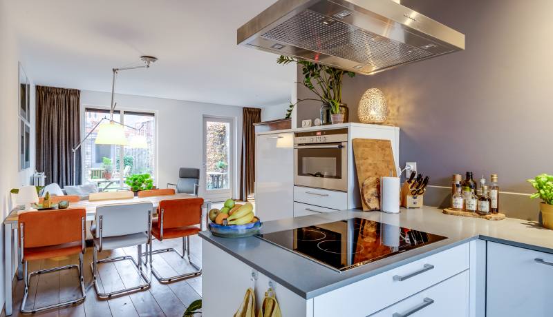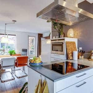 De keuken aan de voorzijde is praktisch ingedeeld en uitgerust met de benodigde inbouwapparatuur. Hier kun je fijn koken, borrelen en uitgebreid tafelen.