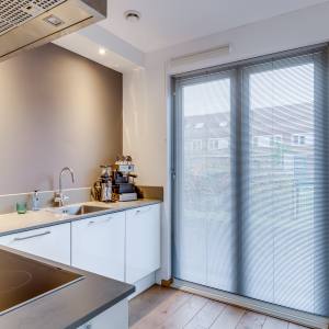 Via de voortuin kom je binnen in de hal, waar zich het toilet bevindt en de trap naar boven. Vanuit de hal loop je door naar de ruime en lichte woonkamer. Aan de tuinzijde vind je de zithoek, terwijl de eethoek richting de keuken ligt. Grote raampartijen zorgen voor volop daglicht en een ontspannen sfeer.