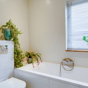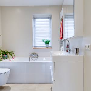 Op de eerste verdieping kom je op een centrale overloop die toegang geeft tot drie lichte slaapkamers. Twee kamers liggen aan de rustige achterzijde en één aan de voorzijde. De badkamer op deze verdieping is modern uitgevoerd en beschikt over een bad, douche, wastafel én toilet, ideaal voor comfortabel gezinsgebruik.
