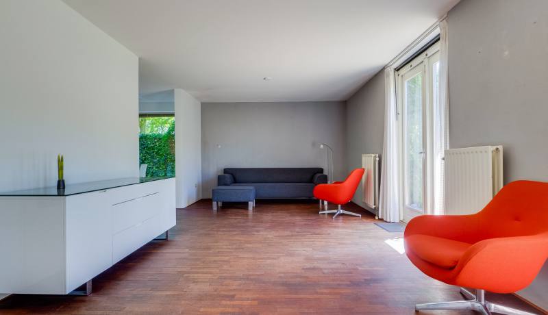 Begane grond: Entree, zeer ruime hal met toilet en handige kast waar eventueel een aansluiting zit voor een wasmachine. Toegang tot de woonkamer. De woonkamer is over de volle breedte ( 8,5 meter) en grenzend aan de woonkamer is een ruime leefkeuken. Via dubbele openslaande deuren bereik je de tuin. De keuken met ledverlichting op het aanrecht is voorzien van alle denkbare inbouwapparatuur zoals vaatwasser, koelkast, combioven/magnetron, inductiekookplaat en afzuigkap. Ook vanuit de keuken bereik je de tuin.